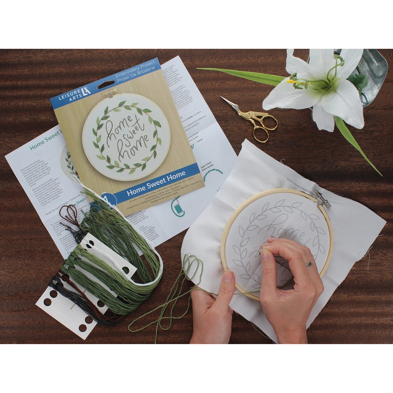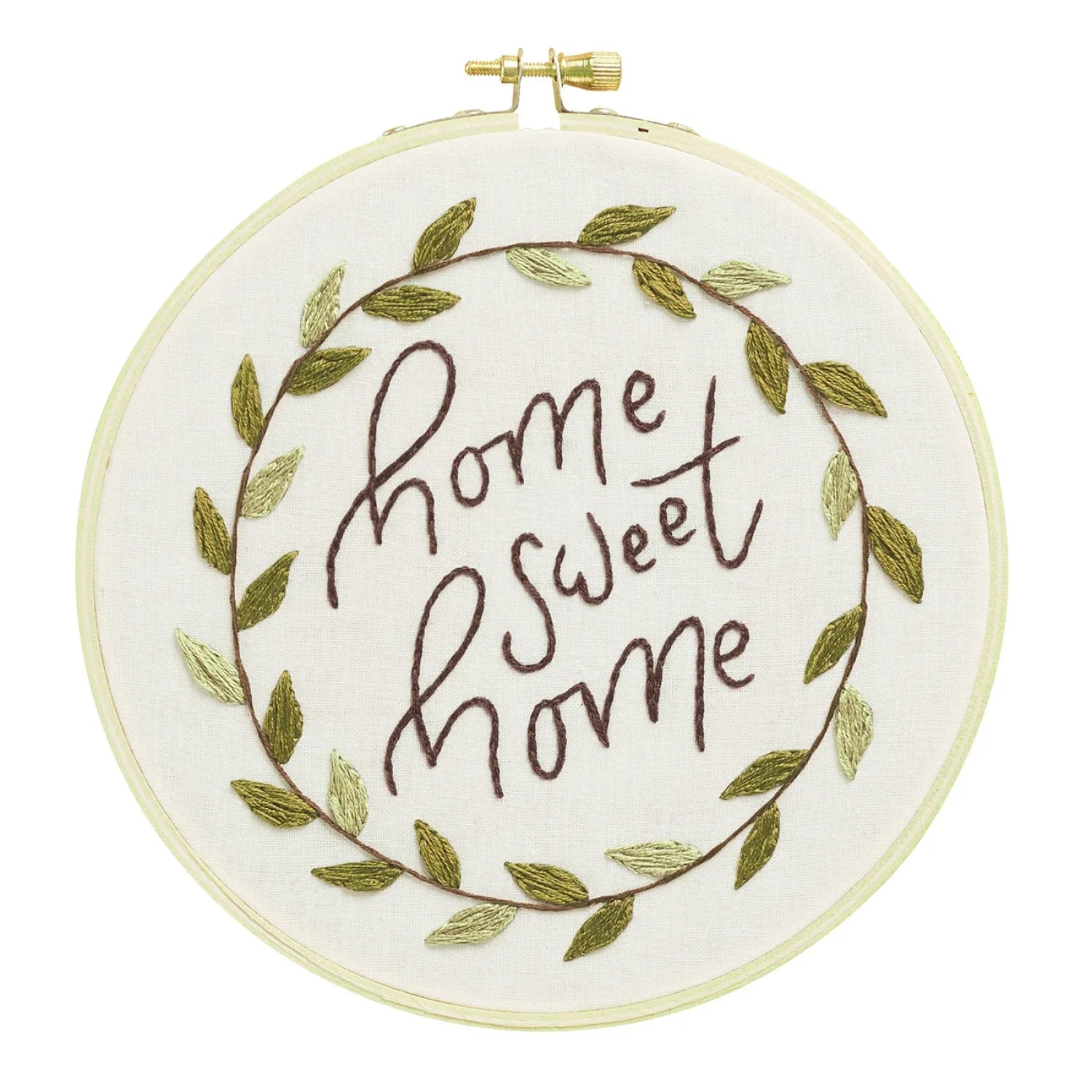 Leisure Arts Embroidery Kit 6" Home Sweet Home- Printed embroidery design features a circular leafy vine wreath with the caption: home sweet home, in the center. Includes 6" wooden embroidery hoop, embroidery floss, printed fabric, embroidery needle and full-color, step-by-step instructions. Use the embroidery hoop to keep the fabric taught and then to display your project. Makes 1 design. Colors and contents may vary.