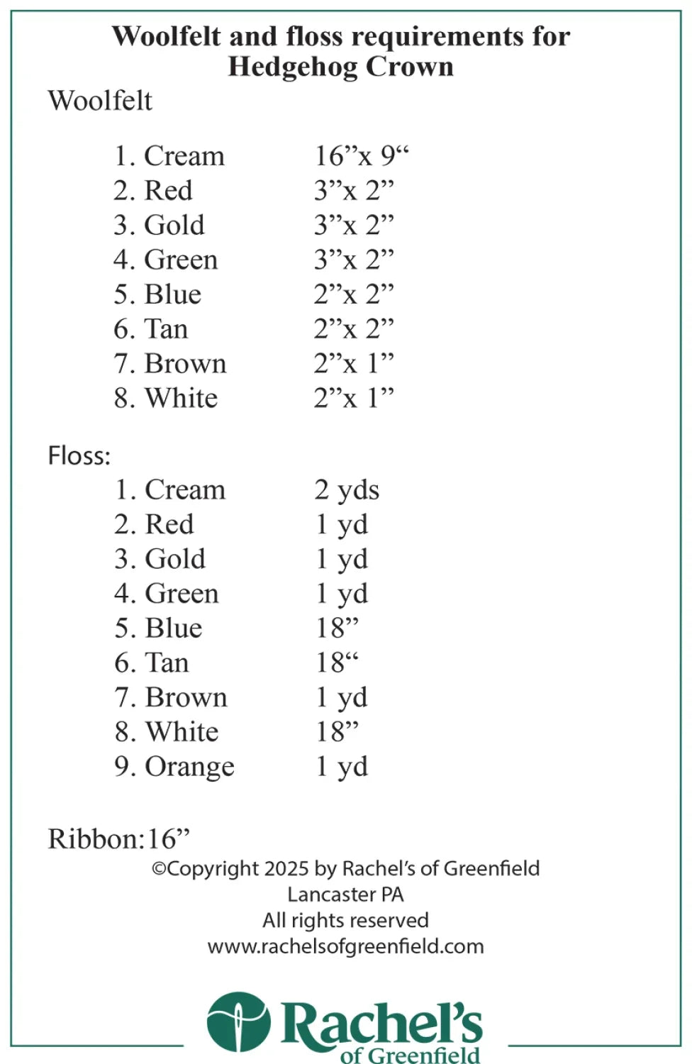 The Hedgehog Birthday Crown Kit includes all woolfelt, floss, and templates needed to complete the birthday crown. The crown measures 15” and is made adjustable by the included ribbon. The birthday crown is made with fun colors of beige, blue, red, gold, and green. The Birthday Crown kit is not complicated. Pieces are cut using templates which are included with the pattern. The Cut pieces are then appliqued in place following the illustrated instructions. Decorative Stitches can be added if desired according to your taste. The pattern, which is included with the kit, provides detailed, illustrated instructions for various stitch types. For those who want to challenge themselves, you can add your own personal touches with stitches and embellishments not listed on the pattern. This is a complete Kit which includes pattern, woolfelt, templates, illustrated instructions, needle, and floss.