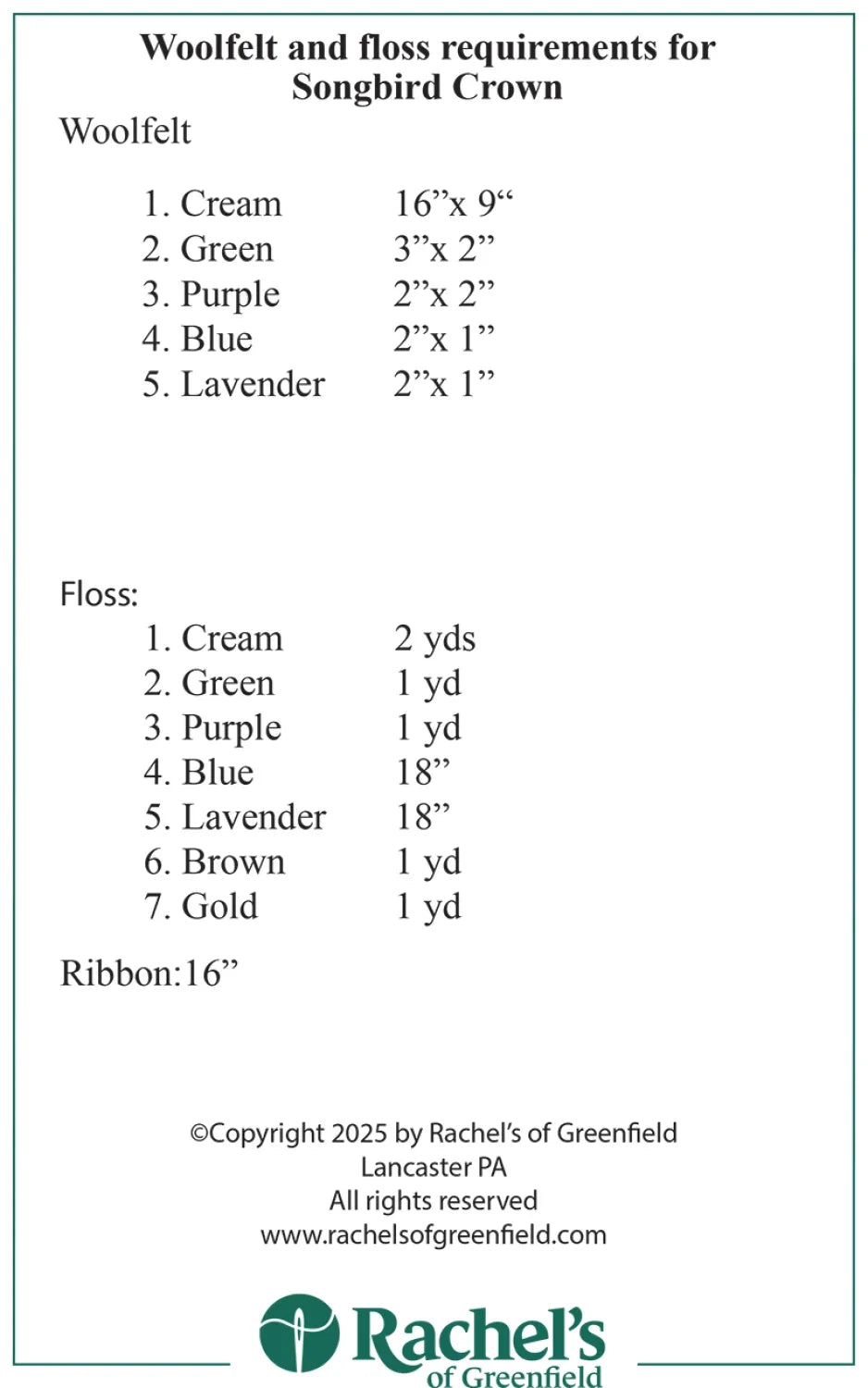 The Songbird Birthday Crown Kit includes all woolfelt, floss, and templates needed to complete the birthday crown. The crown measures 15” and is made adjustable by the included ribbon. The birthday crown is made with fun colors of beige, blue, red, lavender, and green. The Birthday Crown kit is not complicated. Pieces are cut using templates which are included with the pattern. The Cut pieces are then appliqued in place following the illustrated instructions. Decorative Stitches can be added if desired according to your taste. The pattern, which is included with the kit, provides detailed, illustrated instructions for various stitch types. For those who want to challenge themselves, you can add your own personal touches with stitches and embellishments not listed on the pattern. This is a complete Kit which includes pattern, woolfelt, templates, illustrated instructions, needle, and floss.