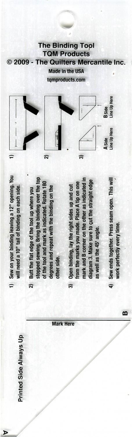 The Binding Tool is a must have tool for every quilter. When you finish the last seam of the binding only an angle seam will work to reduce the bulk of this last step. The Binding Tool makes a perfect ending every time. Two measurements and two cuts and you're on your way to a great finish.